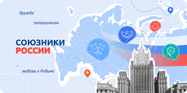 Цель занятия в 1-11 классах: познакомить с понятиями союзник, дипломат, подвести обучающихся к пониманию того, что союзники России, – это страны и люди, с которыми у нас общие ценности, цели и мировоззрение; познакомить младших школьников с различными примерами совместной деятельности России и стран-союзников; воспитывать чувство любви и уважения к своей Отчизне