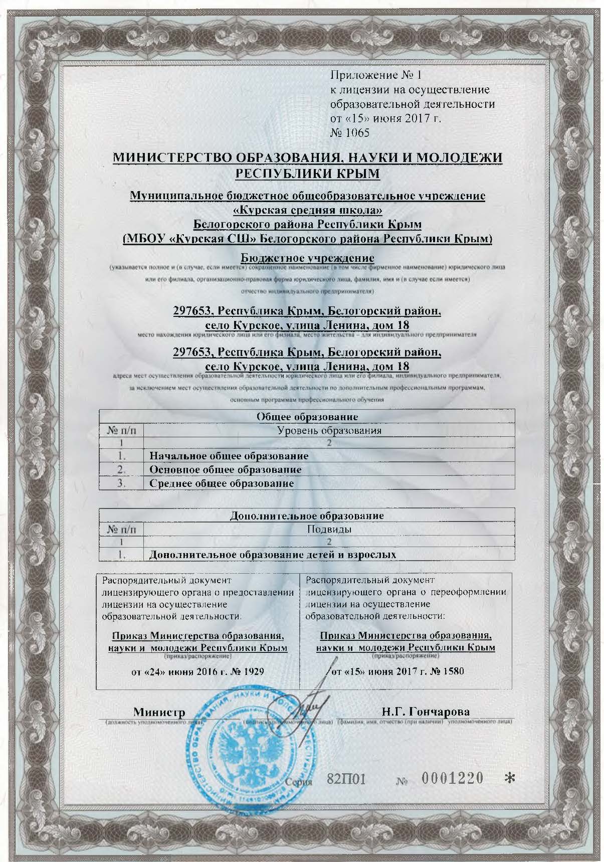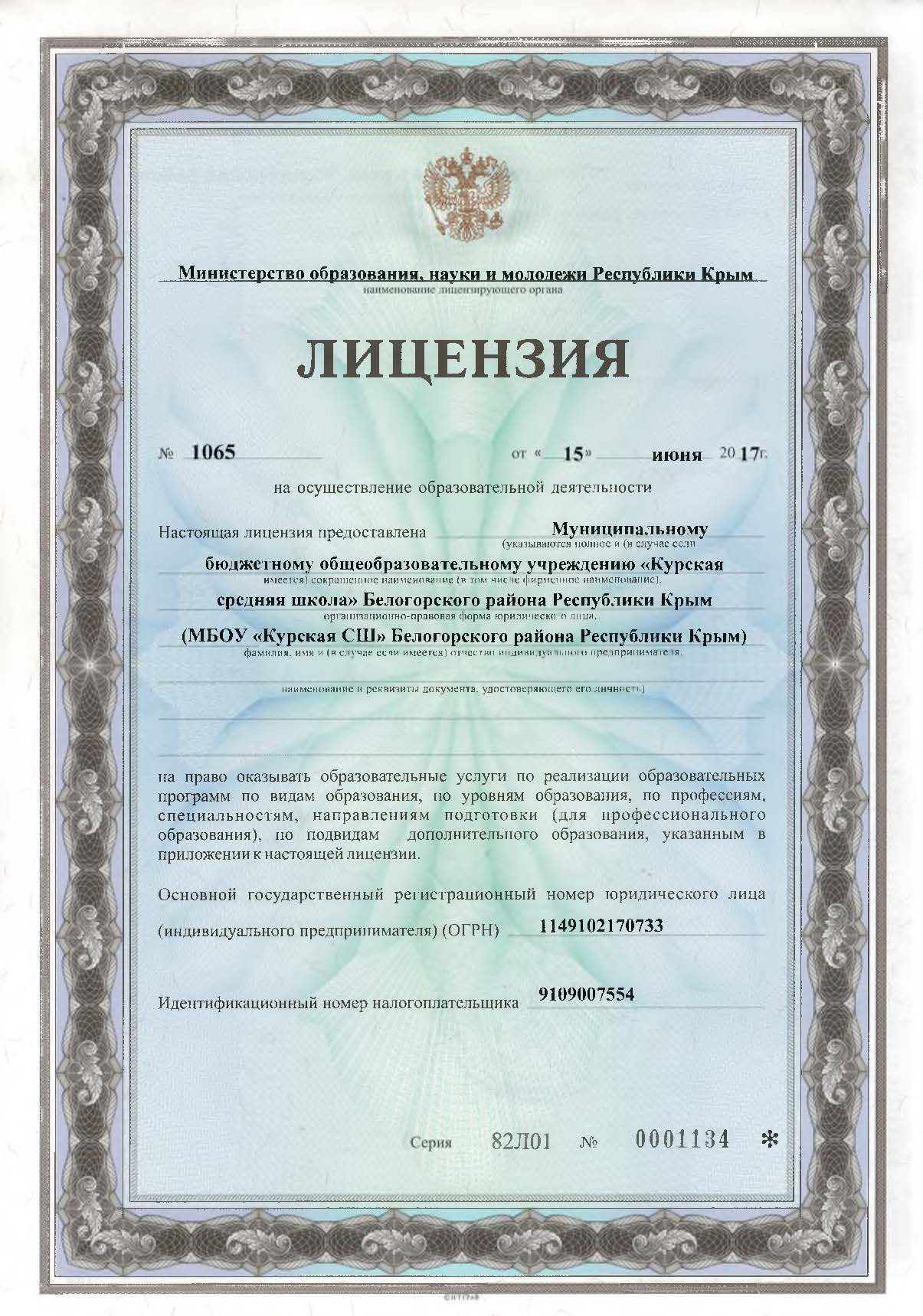 Лицензия на осуществление образовательной деятельности МБОУ "Курская СШ" Белогорского района Республики Крым